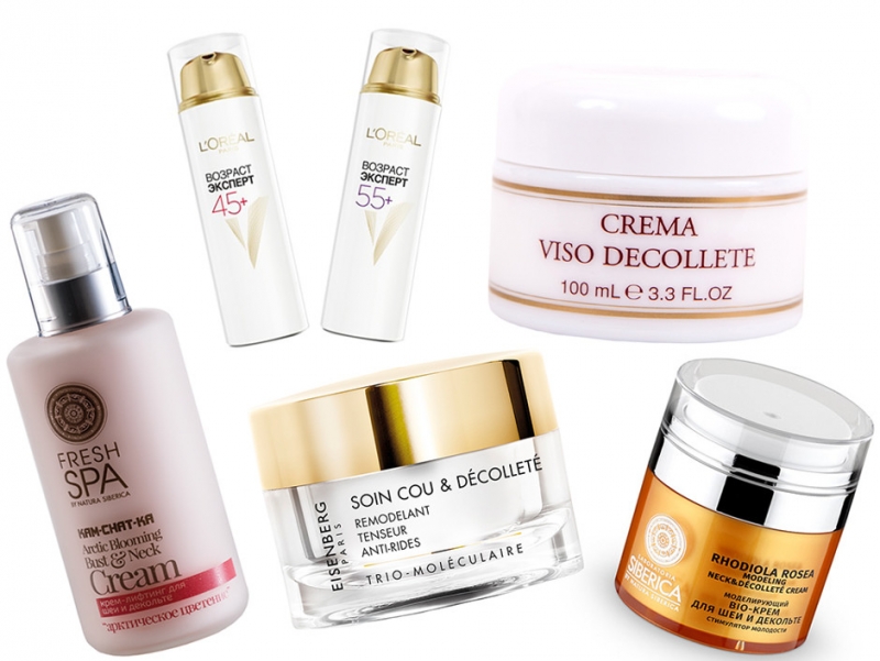 Кремы для кожи шеи, декольте и груди: Kam-chat-ka «Арктическое цветение», Fresh Spa by Natura Siberica; «Возраст эксперт 45+ и 55+», L'Oreal Paris; Crema Viso Decolette, Santa Maria Novella; Trio-Moleculaire, Eisenberg; Rhodiola Rosea, Laboratoria Siberica by Natura SIberica.