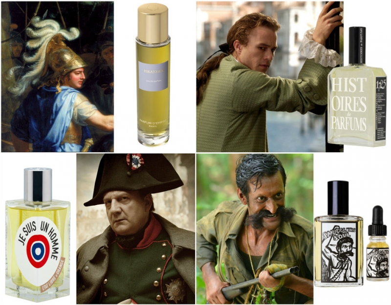 Александр Македонский и Iskander, Parfum d'Empire; Джакомо Казанова и 1725, Histoires de Parfums; Наполеон Бонапарт и Je Suis Un Homme, Etat Libre d'Orange; «индийский Робин Гуд» Вираппан и Smugglers Soul, Lush.