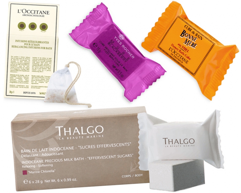 Саше для ванны Aromachologie, L'Occitane; кубики для ванны Mure Blackberry, Yves Rocher; Bonne Mere au Miel, L'Occitane; Effervescent Sugars, Thalgo.