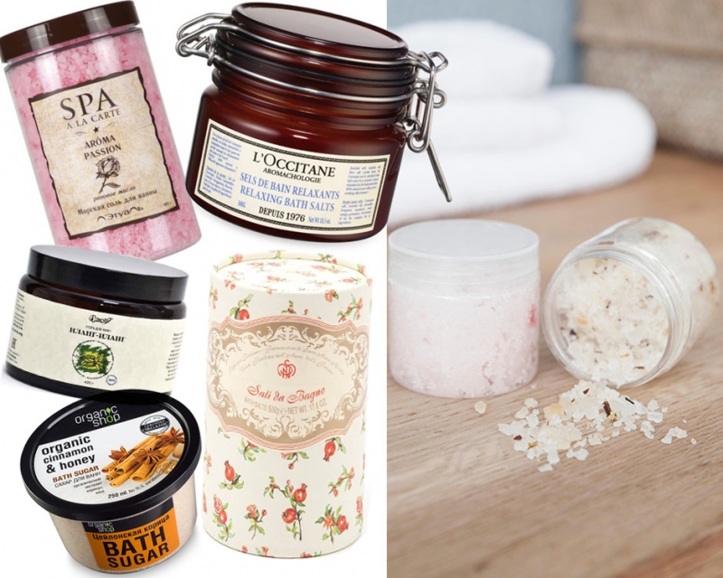Соль для ванны: Aroma Passion Spa a la Carte, L'Etoile; «Иланг-иланг», Mi&Ko; Relaxing Bath Salts, L'Occitane; Sali da Bagno, Santa Maria Novella. Сахар для ванны Organic Cinnamon & Honey, Organic Shop.