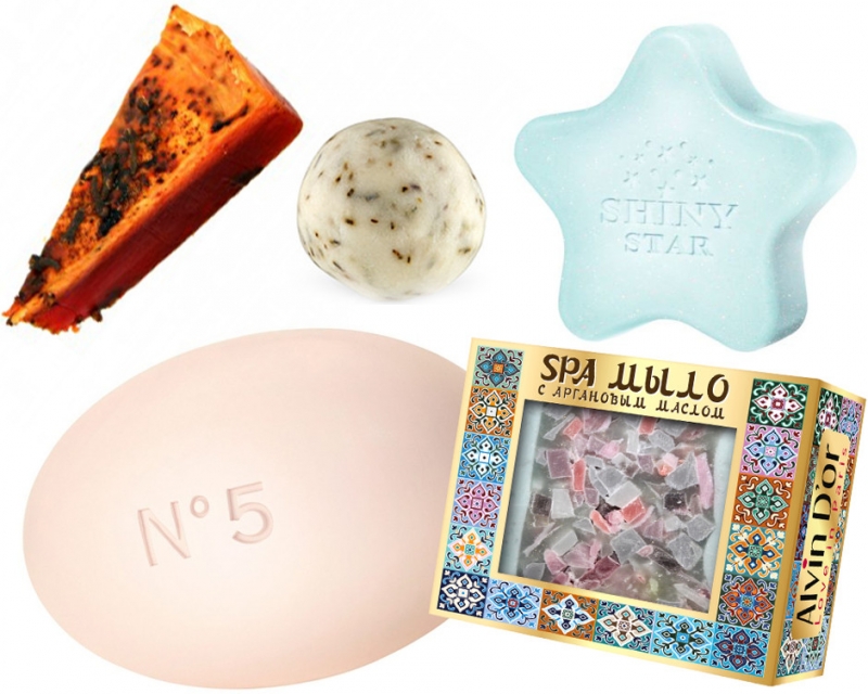 Мыло: «Тыквенный пирог», Shik Halal; #5, Chanel; «Кедровое», Natura Siberica; Shiny Star, Oriflame; Spa-мыло с аргановым маслом, Alvin d'Or.