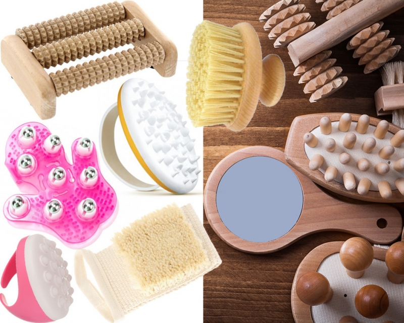 Массажеры: роликовый «Банные штучки»; со встроенными аппликаторами Bradex; Spa Fit, The Body Shop; антицеллюлитный Touchbeauty. Щетка для тела The Body Shop. Мочалка Riffi.