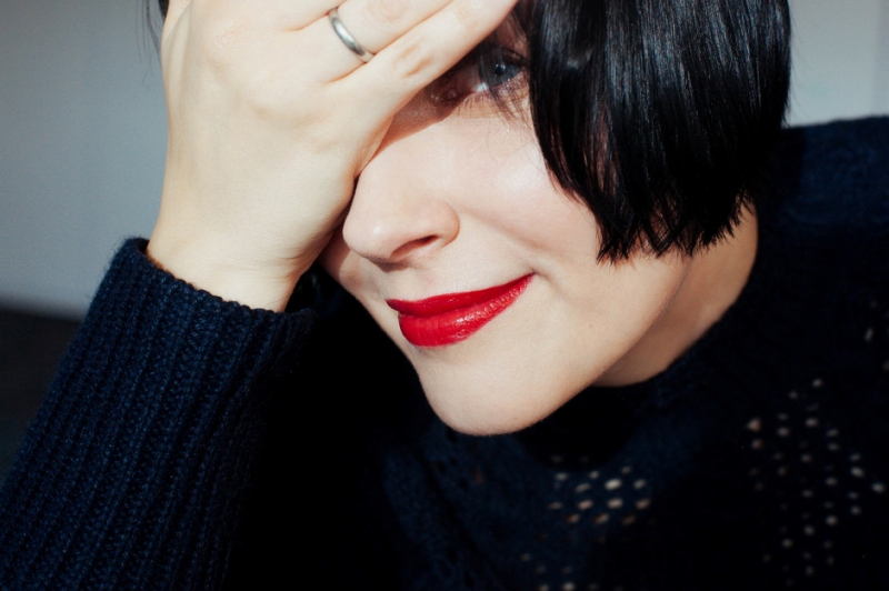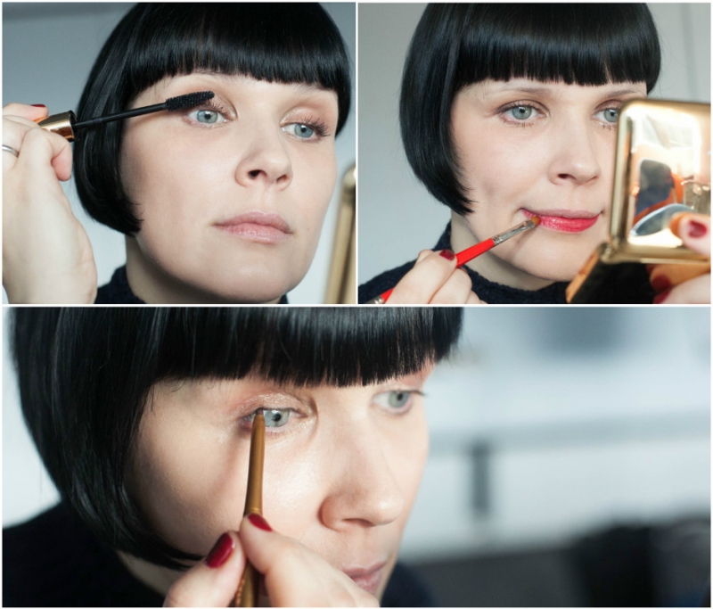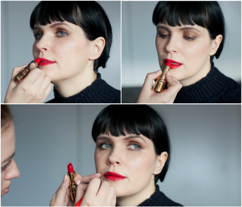 Очень люблю красную помаду и часто ею пользуюсь, особенно осенью, когда в жизни не хватает ярких красок. Губы всегда крашу прямо грифелем, но сегодня вдруг почему-то решаю выпендриться и беру кисть. А зря. У помады довольно мягкая текстура, и прорисовать кистью четкий контур у меня не получается. Провозившись довольно долго, останавливаюсь на том, что заполняю пространство губ цветом, а контур оставляю как есть. То есть кривоватым.