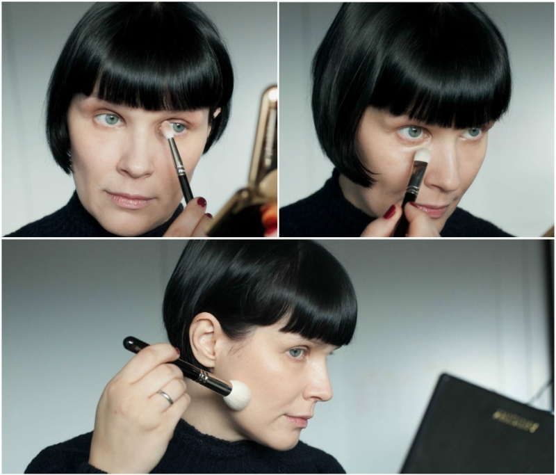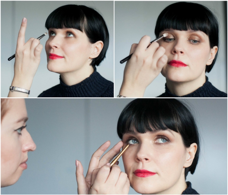 Тогда Анна учит меня правильной растушевке: делать это надо мягкой закругленной кистью, выполняя движения вправо-влево, так тени лягут ровнее. Потом она добавляет моим глазам яркости — наносит еще слой коричневых теней на верхние веки, растушевывает, «вытягивая» цвет к вискам.