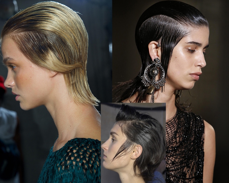 Самым смелым и не боящимся злоупотребить гелем для волос с «мокрым» эффектом – три образца геометрической укладки с фигурными висками, импровизированным «ирокезом» и гладким затылком от стилистов, работавших за кулисами шоу Alexander McQueen, Missoni, Sacai.