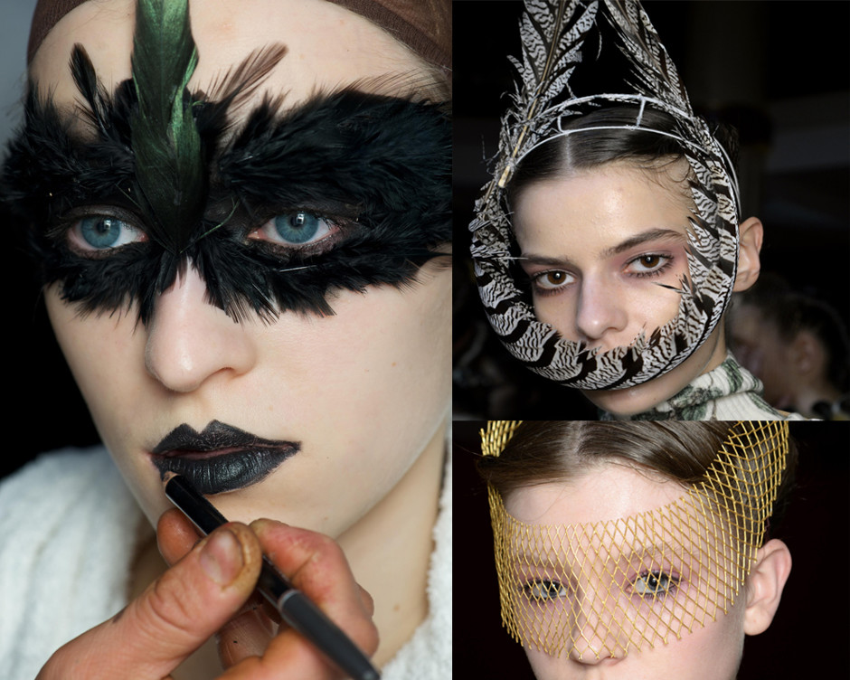 «Лень заморачиваться с макияжем? Наденьте маску», — как бы намекают визажисты, работавшие за кулисами Gucci и Undercover. Маска может быть любой: сеточка-вуаль в ретростиле или карнавальная из перьев.