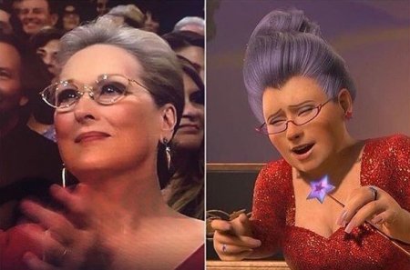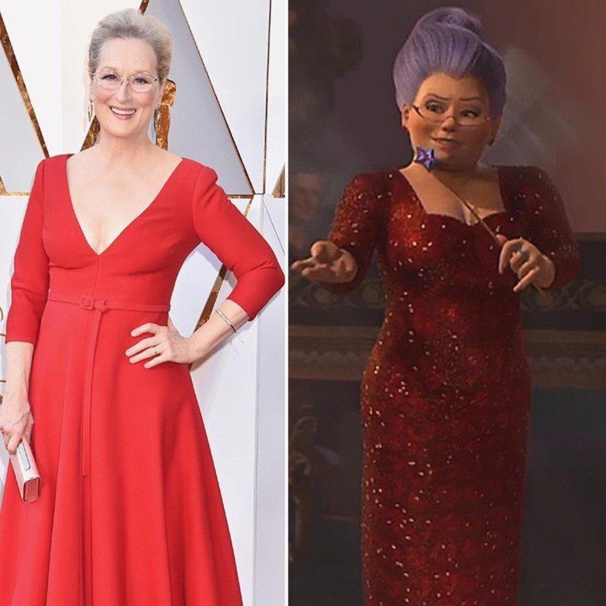 После того как Мэрил появилась на красной ковровой дорожке в красном платье, очках и с волосами, убранными в пучок, интернет-пользователи начали думать, кого же им это все напоминает. А Мэрил вела себя так активно и заводно, что долго думать не пришлось: фею-крестную из мультфильма «Шрек».