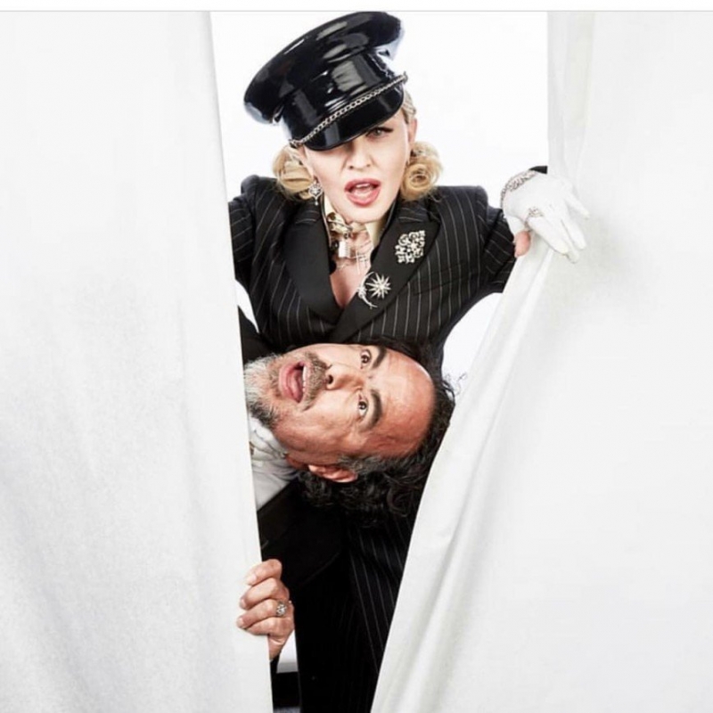 Мадонна акцентировала внимание на надетой набок фуражке, в которой она напоминала полицейского. Ну и, конечно же, не обошлось без колготок сеточкой, которые подчеркнули стройные ноги певицы. Компанию ей составила телезвезда Ким Кардашьян, вместе с которой они позировали для камер. Правда, она была одета куда скромнее.