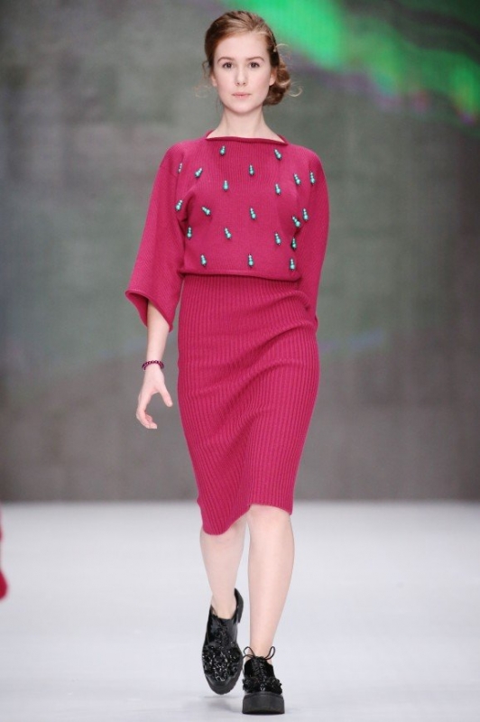 Рюкзаки, сумки и береты в коллекции тоже вязаные и сочетаются с брючными костюмами из парчи. Верхняя одежда здесь строгих силуэтов и цветов: темно-зеленый кейп с пайетками на груди и шуба винного оттенка. Длинные вечерние платья с цветочными принтами и воланами выполнены в испанском стиле, придавая коллекции колорита. Показ закончился блестящим выходом модели в пышном платье изумрудного цвета с перьями на верхней части корсета и полностью усыпанном камнями и пайетками.