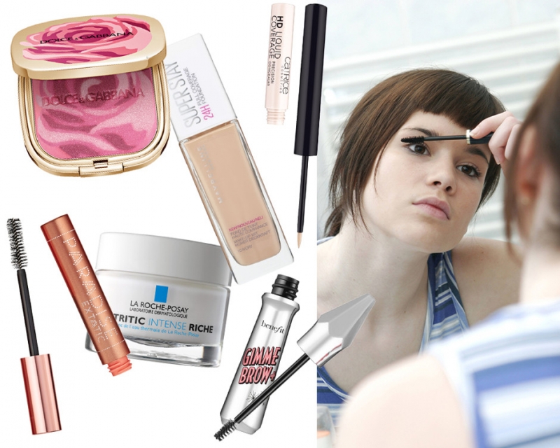 Румяна Rosa Duchessa, Dolce&Gabbana; Тушь для ресниц Paradise Extatic, L'Oreal Paris; Гель для бровей Gimme Brow, Benefit; Тональное средство Super Stay, Maybelline; Консилер HD Liquid Coverage, Catric; Питательный крем Nutric Intense Riche, La Roche-Posay
