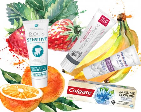 Восстанавливающая и отбеливающая паста, R.O.C; Паста «Отбеливание плюс», Splat; Паста 3D White Luxe, Blend-a-med; Паста для безопасного отбеливания «Древние секреты», Colgate;
