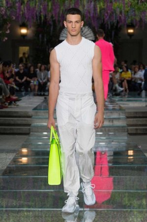 Этот мужчина легко и с иронией смешивает шнуровку и тонкую почти прозрачную ткань, неон и цветочные принты. Традиционные строгие пиджаки комбинируются с брюками в стиле багги из денима. Принт Tabloid служит напоминанием о мире звезд, в котором мы живем.
