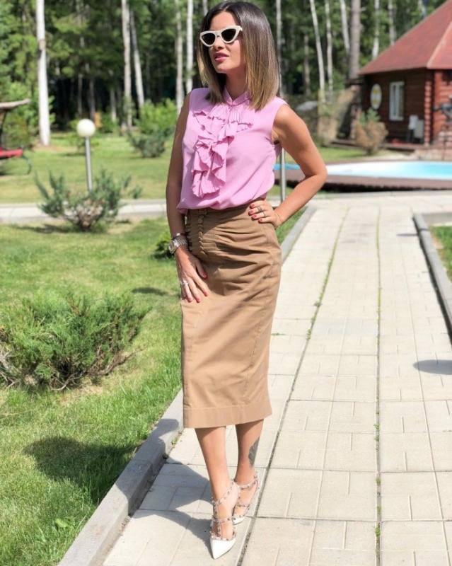 35-летняя Ксения Бородина уже много лет является бессменной ведущей проекта «Дом – 2», кроме того, она ведет передачу «Перезагрузка», где команда профессионалов занимается преображением девушек. Обычно вкус и чувство стиля восхищают ее поклонников, однако и с модницами случаются казусы. На днях Ксения решила поделиться с 11 миллионами своих подписчиков летним образом, в котором она отправилась с утра на работу. На Бородиной была надета нежная блузка лилового цвета с жабо и светло-коричневая юбка ниже колен. Образ завершали модные очки с белой оправой и белые босоножки с шипами. Больше всего подписчики Ксении обратили внимание на декоративный элемент спереди юбки в виде пуговиц на присборенном участке ткани. Эта деталь визуально увеличила живот Бородиной, и ее поклонники принялись радостно писать о беременности звезды. При этом некоторые уверены, что Ксения не беременна, но юбка все равно крайне неудачная.