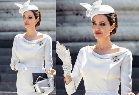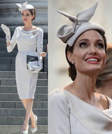 Бывшая возлюбленная Брэда Питта отлично выглядела в строгом светлом платье и перчатках, ее голову украшала вычурная шляпка замысловатой формы. Джоли украсила уши серьгами с камнями и не забыла прикрепить к платью орден, который ей вручила королева Великобритании Елизавета II за активную благотворительную деятельность.