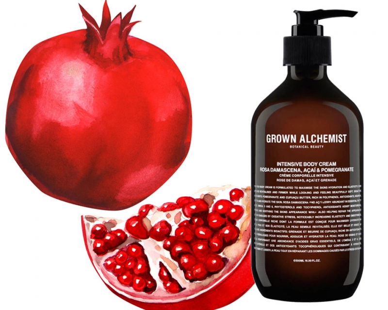 Крем для увлажнения. «Воды!» — буквально умоляет кожа в жару, средства с гранатом как раз умеют ее доставить (правда, важно знать правила, чтобы не переборщить с этим самым увлажнением). Крем для тела Intensive Body Cream от Grown Alchemist интенсивно увлажняет и питает кожу. Экстракты дамасской розы, граната и асаи способствуют регенерации клеток, придают коже эластичность и смягчают наиболее сухие участки. Крем подходит для всех типов кожи. Цена (за 500 мл): 3500 рублей.
