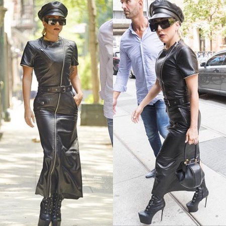 Известная на весь мир поп-дива Леди Гага вновь шокировала своих поклонников неожиданным образом, в котором появилась на днях в Нью-Йорке. 32-летняя исполнительница прогуливалась среди обычных американцев в кожаном облегающем длинном платье и сапогах на высокой платформе. Завершающим штрихом весьма провокационного образа стала кожаная фуражка, напоминающая атрибут военной формы.