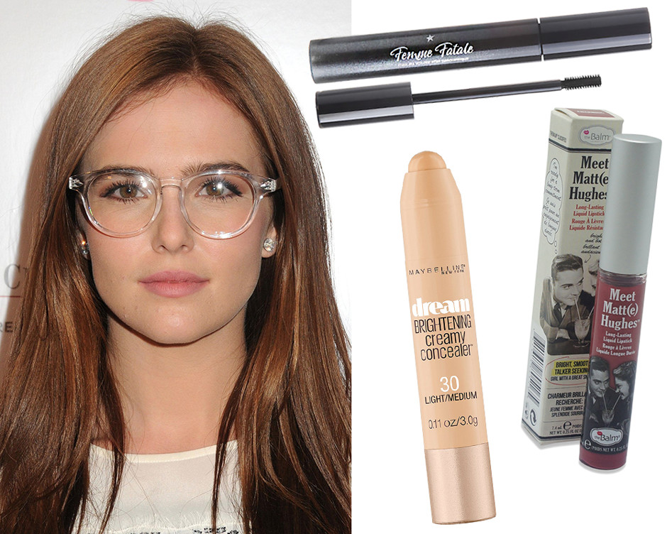 Актриса Зои ДойчМатовый блеск для губ Meet Matt(e) Hughes, оттенок Charming, theBalmКонсилер Brightening Creamy Concealer, Maybelline NYОбъемная тушь Femme Fatale, Л'Этуаль