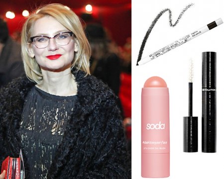 Очки с крупной оправой, пусть и прозрачной, — тоже важный акцент. Визажист советует именно с ней включать в образ яркие тени и подводку: ярко-розовые, персиковые, синие — ты не должна бояться играть на контрасте. Для губ можно выбрать матовую помаду спокойного оттенка.