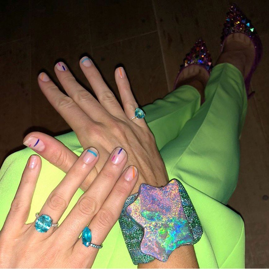 Для похода в кино актриса выбрала брючный костюм сочного неоново-зеленого цвета и создала монохромный образ, подобрав под свой наряд блузку идентичного оттенка. Переливающиеся разноцветными стразами туфли на каблуке, затейливый браслет и радужный маникюр завершили внешний вид знаменитости, сделав ее центральной звездой светской вечеринки.