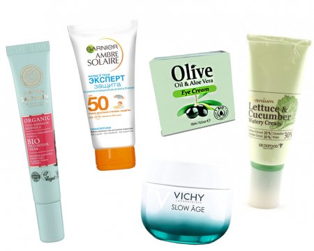Восстанавливающий крем против воздействия факторов внешней среды, VichyУльтраувлажняющий крем с салатом-латуком и огурцом, SkinfoodКрем для глаз с алоэ вера и оливковым маслом, MadisУльтранежный солнцезащитный крем, Garnier Ambre SolaireКрем для кожи вокруг глаз против воздействия окружающей среды Natura Sakhalin, Natura Siberica