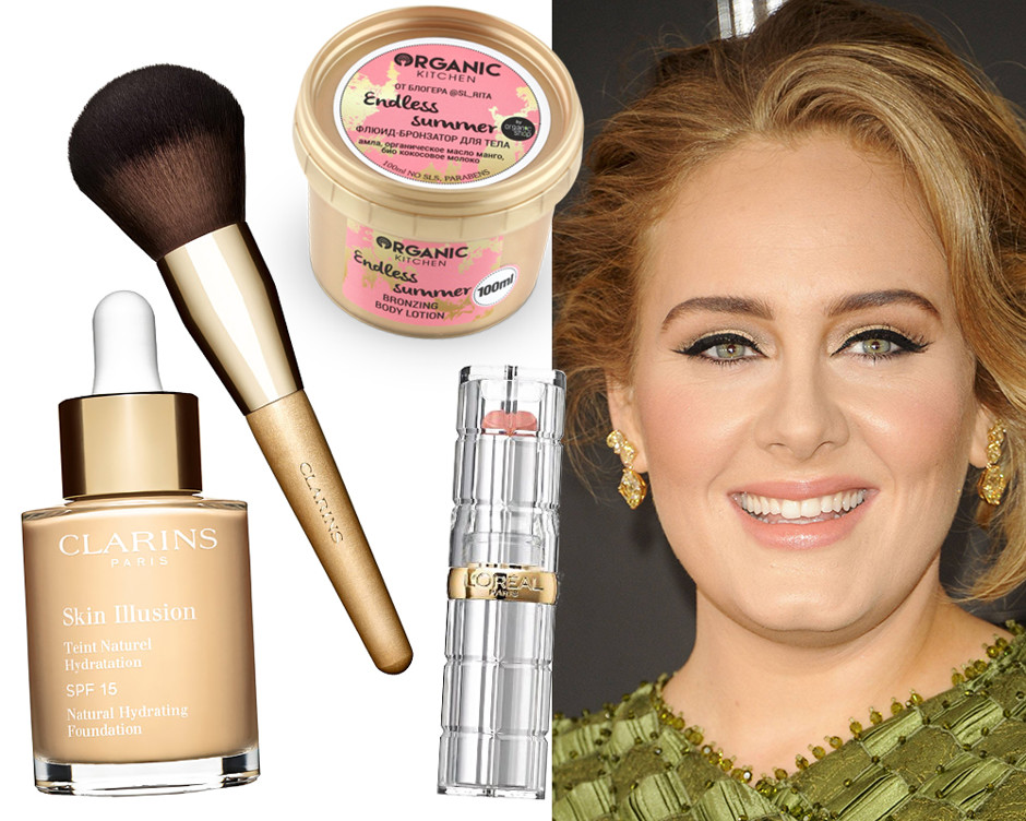 Флюид-бронзатор для тела Endless Summer, Organic ShopКисть Powder Brush, ClarinsУвлажняющий тональный крем Skin Illusion SPF 15, Clarins Помада Color Riche, оттенок Topless, L'Oreal Paris Певица Адель