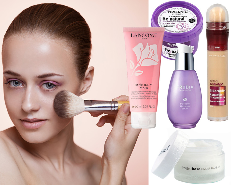 Увлажняющая база под макияж, PaeseУвлажняющий крем для выравнивания цвета лица, Organic KitchenМаска для восстановления ровного сияющего тона Hydra Zen Jelly Mask, Lancome Увлажняющая сыворотка Blueberry Hydrating Serum, FrudiaКорректор, Maybelline NY