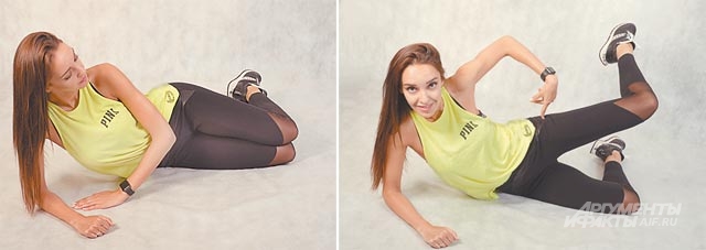 Лягте на бок, обе ноги согните в коленях. Не разгибая колена, поднимите верхнюю ногу под углом 45 градусов к полу. Медленно опустите ногу в исходное положение. Повторите по 10 раз каждой ногой.