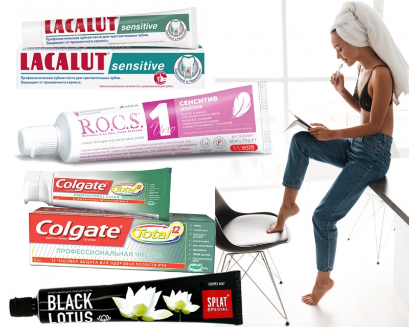 Зубная паста для чувствительных зубов, R.O.C.S.Паста с фторидом Total 12, ColgateОтбеливающая зубная паста, SplatЗубная паста для чувствительных зубов, Lacalut
