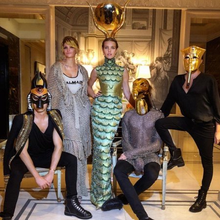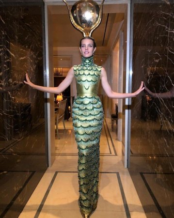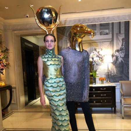 Необычное чешуйчатое зеленое платье в пол, а также массивные золотые рога на голове помогли Водяновой стать почитаемой богиней. Примечательно, что на вечеринку Наталья отправилась в сопровождении 16-летнего сына Лукаса, который всецело поддержал мать своим костюмом, скрыв лицо под золотой маской сокола и надев рубашку-кольчугу. Юноша перевоплотился в Гора, бога неба и солнца, который по легенде приходится Исиде сыном.