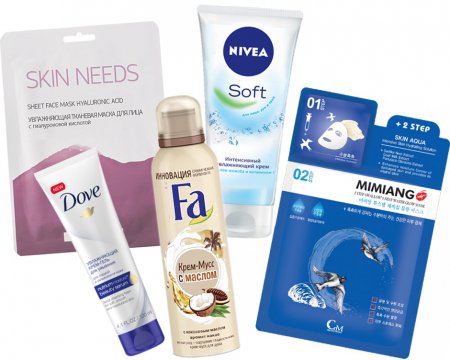 Крем-мусс с кокосовым маслом, Fa (165 рублей)Увлажняющий крем-гель для умывания, Dove (279 рублей)Увлажняющая маска с гиалуроновой кислотой, Skin Needs (49 рублей)Двухфазовая маска для интенсивного увлажнения, Mimiang (150 рублей)Интенсивный увлажняющий крем, Nivea (129 рублей)