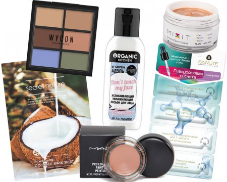 Палетка консилеров, WyconПитательная маска с кокосом, Secret Nature Устойчивые кремовые тени для век, M.A.CУспокаивающий увлажняющий лосьон для лица, Organic Kitchen Сыворотка с гиалуроновой кислотой, Skinlite