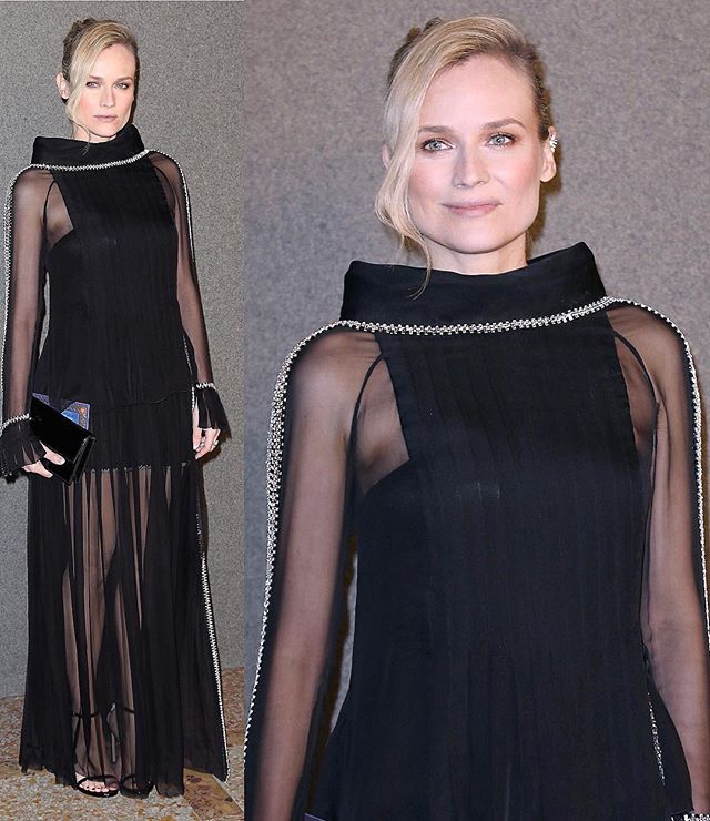 Украшенное несколькими линиями страз, темное платье эффектно подчеркивало белизну кожи Крюгер и гармонировало с укладкой ее светлых волос. Заколотые на затылке локоны открывали тонкие черты лица актрисы, позволяя одной единственной пряди спадать на лицо Дианы.Завершил элегантный образ звезды естественный макияж.