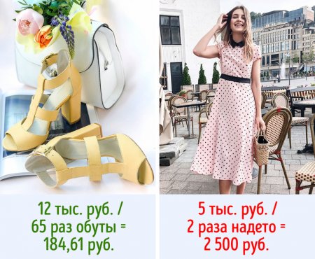 Каждая вещь в шкафу должна отрабатывать свой ценник на все 100 %. Чтобы узнать, сколько реально стоит пара дорогих туфель или платье, используйте простую формулу: цену вещи поделите на количество раз, сколько вы ее наденете. Это позволит избежать ненужных трат и приучить себя покупать только то, что будет действительно востребовано. Также формула помогает решиться на покупку дорогих вещей.
