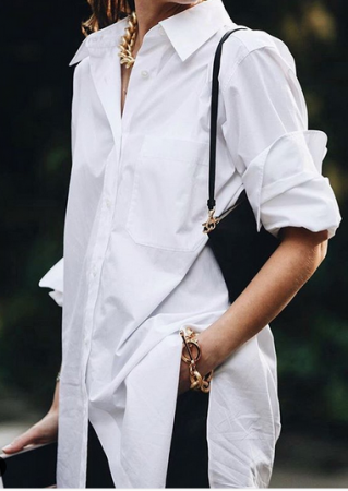Рубашки. Несколько вариантов. В первую очередь белая, с хорошей плотностью. Но подходят и голубые, похожие на классические мужские костюмные варианты. У базовой рубашки не должно быть никаких лишних деталей. Самая простая модель, которая сидит на вас идеально.