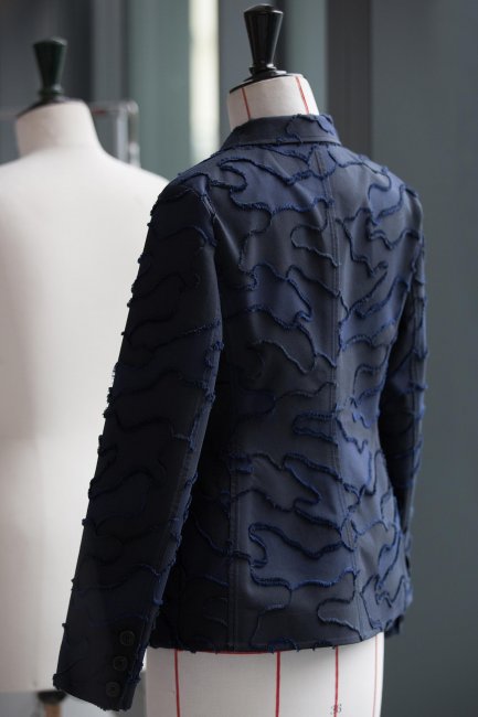 Гипнотический узор из бахромы оживает на жаккарде синего оттенка — одного из любимых цветов Кристиана Диора. Подкладка украшена знаменитым принтом Dior Oblique. Для создания такого жакета требуется огромное мастерство, начиная с разработки узора и до мельчайших деталей пошива.