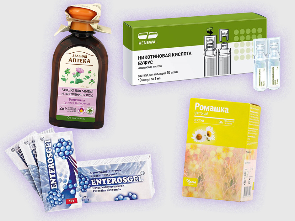 Репейное масло, Зеленая аптека; Никотиновая кислота; Фиточай с ромашкой; Энтеросгель