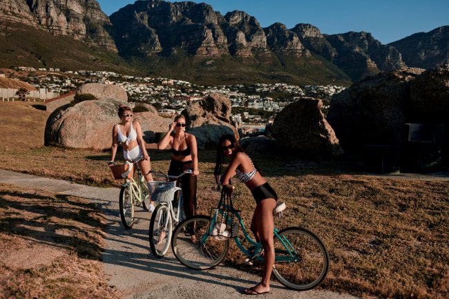 Не обошлось в капсуле и без аксессуаров: вместительной пляжной сумки и сланцев из прозрачного винила, а также резинок-браслетов для волос.