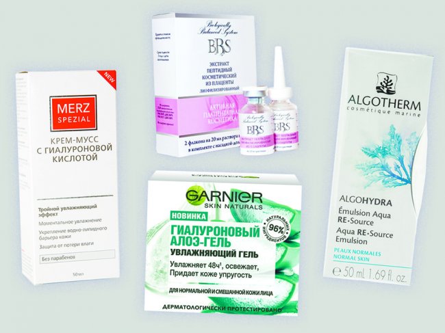 Крем-мусс с гиалуроновой кислотой, MerzГиалуроновый крем-гель, Garnier Гиалуроновая эмульсия, AlgothermОмолаживающий экстракт с пептидами, BBS