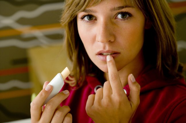 Защитить губы поможет гигиеническая помада или бальзам. Если специальных средств нет, можно использовать оливковое или другие масла. Наноси бальзам или гигиеническую помаду каждый раз после умывания, после чистки зубов, после еды и питья (даже если ты выпила лишь чашку кофе или стакан воды), перед выходом на улицу, после посещения бассейна, перед сном.