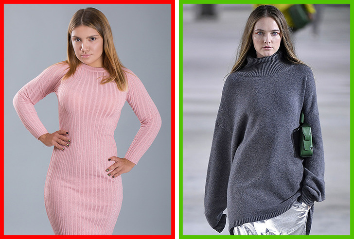 Облегающие трикотажные платья быстро теряют свой вид, а еще постоянно нужно думать о том, чтобы не было видно очертаний нижнего белья и швов от колготок. Дизайнеры в 2019 году предлагают носить свитера свободного кроя с облегающими юбками длины миди. А самый смелый, но модный вариант — объемный свитер и серебристая юбка-карандаш.