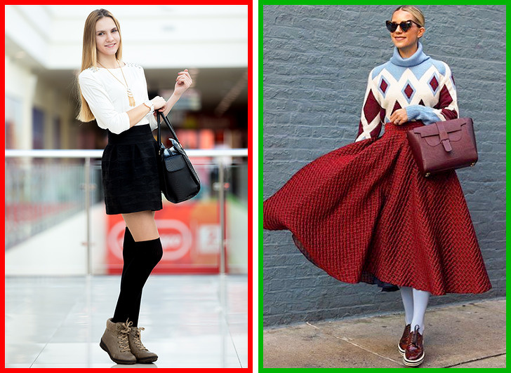 Пожалуй, эта тенденция — одна из самых заезженных. Девушки не хотят расставаться с короткими юбками в холодное время года и пытаются «утеплить» образ гольфами, надевая их на тонкие капроновые колготки. Обычно это сочетание еще дополняют «шубой автоледи»: девушки наивно пытаются «сгладить» совсем не зимний образ мехом. Такой устаревший и непрактичный дуэт можно заменить на теплые колготки и юбку актуальной длины миди.