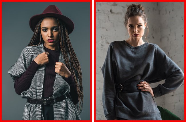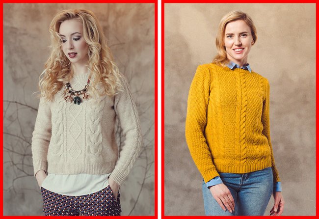 Рубашка или футболка под свитером были популярны много лет назад, как и крупное колье под воротником, а сейчас это выглядит очень скучно. В моде удлиненные однотонные свитера крупной вязки.