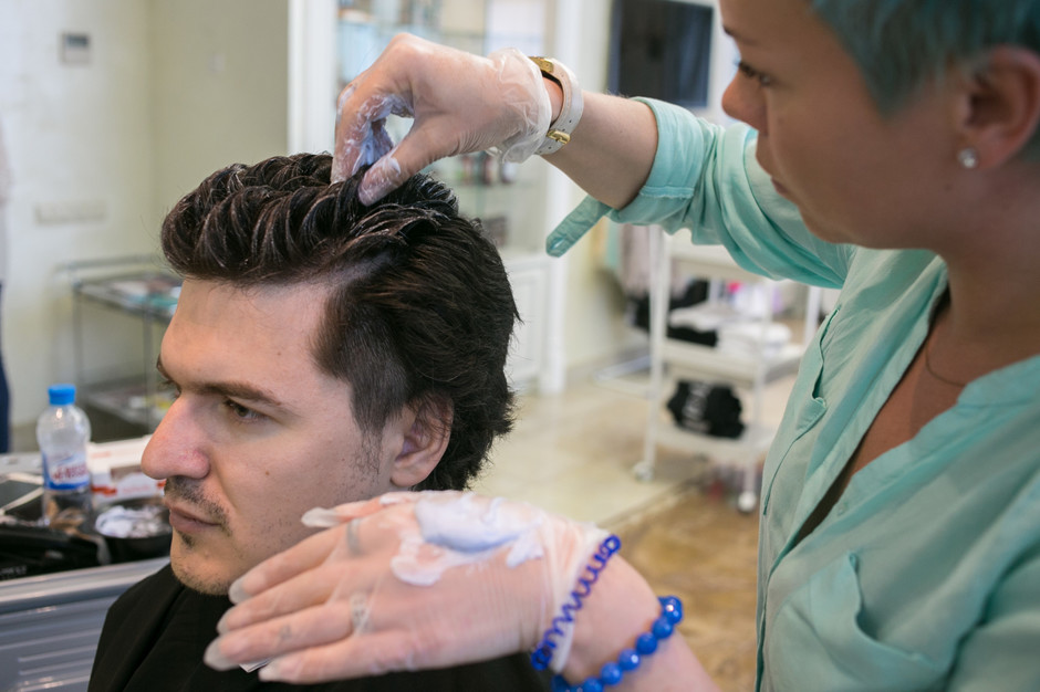 Стрижка проходил в два этапа: Наталья триммером очертила контуры, и приступила к предварительному осветлению. Необычному — осветляющую смесь она наносила на кончики волос пальцами, как воск или глину для укладки, не прибегая к помощи кисти. Благодаря тому, что сам состав достаточно густой, волосы удержали форму и краситель не попал на соседние пряди. Этот прием можно взять на вооружение обладательницам коротких стрижек, которые хотят освежить цвет волос летом и добавить выгоревших прядей, обычно именно с такой длиной самостоятельно орудовать кистью сложнее всего. Пока состав работал, Наталья срезала все лишнее на висках и затылочной части головы. После этого осветленные участки тонировали: Наталья выбрала бордово-коричневый оттенок красителя Ian Zachary. И тут наконец мы увидели, почему представители сильного пола не любят красить волосы: Саша выдержал положенное время мужественно, но все же морщась, ерзая, и задаваясь вопросом: как же девушки терпят эту БОЛЬ?