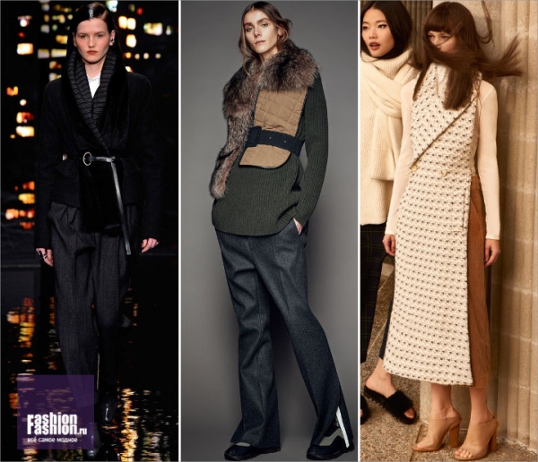 #1 - Look с показа коллекции Michael KorsОснову комплекта составляют базовые вещи: рубашка в чёрно-белую полоску, пуловер из мохера, серые клетчатые брюки, чёрные ботинки-броги. Комплект вполне можно носить в базовом варианте.#2 - Базовый комплектНо актуальная деталь - необычный шарф с меховым воротником - не только добавляет остроты, но и вносит женственность в комплект, имеющий мужскую стилевую окраску. Шарф напоминает по крою деталь пальто или жакета с шалевым воротником, фиксируется при помощи ремня.#3 - Комплект, дополненный шарфомОбратите внимание на используемое в этом образе сочетание классических принтов: двух видов клетки и полоски.#4 - ДеталиВ этом луке используется модный прием, определяющийся формулой: простая основа + необычное дополнение, которое можно менять от сезона к сезону и тем самым вносить разнообразие в базовые комплекты.В коллекции от Michael Kors представлены различные варианты простых комплектов, дополненных шарфами с воротниковой конструкцией:#5 - Michael KorsПодобные шарфы, позволяющие трансформировать базовые комплекты в более сложные и интересные, найдем и в коллекциях других дизайнеров:#6 - Donna Karan, Marni, Rosetta Getty