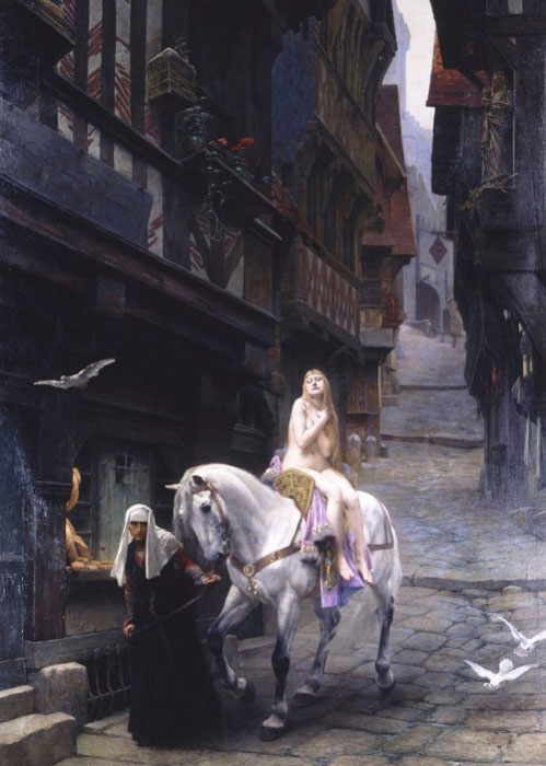 Наверняка, каждый хоть раз слышал о леди Годиве. Отважная женщина решилась проехать по улицам города верхом на лошади обнажённая, чтобы освободить от налогов его обитателей. В Британии этот персонаж настолько популярен, что все жители уверенны в реальности легенды, действия которой относятся к началу 11 века. На самом деле леди Годива сняла с себя всю одежду ради общего блага – попробуем разобраться в этом обзоре. Леди Годива. Статуя. Легенда гласит, что леди Годива была красавицей-женой графа Леофрика (968-1057 гг). Её супруг не отказывал себе в удовольствии облагать непосильными налогами жителей города Ковентри. Из сострадания к людям леди Годива несколько раз умоляла графа снизить налоги. Устав от её настойчивости, Леофрик в сердцах произнёс: если жена согласится проехаться верхом на коне по улицам города обнажённой, то он отменит налоги. Леди Годива решилась на этот шаг и, прикрываясь только лишь волосами, выехала в город. В это время все жители сидели дома с закрытыми ставнями, и только лишь портной Том попытался подсмотреть в замочную скважину. Господь его наказал, и парень тут же ослеп. А графу пришлось сдержать обещание. Леди Годива. Э. Лейтон, 1892. Впервые об этом событии в своей хронике упоминает монах Роджер Вендровер в 1188 году, спустя 100 с лишним лет после смерти леди Годивы. Он даже указывает точную дату события – 10 июля 1040 года. Каждое последующее столетие легенда обрастала всё новыми «подробностями» подвига леди Годивы. Легенда о леди Годиве была настолько популярна, что в 13 веке английский король Эдуард I решил выяснить всю правду о таком экстраординарном событии. Согласно авторитетным хроникам в 1057 году (на 17 лет позже заявленной монахом Роджером даты) в Ковентри действительно были отменены налоги. Но ни в одной из официальных летописей не упоминается об обнажённой даме. Леди Годива. Ж. Ж. Лефевр. Согласно реальным жизнеописаниям леди Годивы и Леофрика, в 1043 году граф построил в Ковентри бенедиктинский монастырь, которому он отдал во владение 24 деревни. Леди Годива, будучи очень набожной, делала щедрые пожертвования церкви, а перед своей смертью и вовсе отдала все свои земли монастырю. Графа и его супругу похоронили в том самом монастыре. Молитва леди Годивы. Э. Лендсиер, 1865 г. Некоторые исследователи находят разгадку обнажённой всадницы в языческом фольклоре. До момента вторжения в Британию норманнов, территорию Ковентри занимало племя англов – мерсийцев, которые поклонялись богине Годе. Каждый год в середине лета богине воздавались почести и устраивались шествия, которые возглавляла обнаженная жрица на коне, олицетворяющая собой Году. Леди Годива. William Holmes Sullivan, 1877 г. В свою очередь католические священники, которые не могли искоренить языческие верования, как правило, подстраивали их под каноны церкви. Поэтому образ языческого божества связали с набожной и сострадательной леди Годивой, добившейся отмены налогов. Людская молва только лишь «отшлифовала» легенду. Начиная с 1678 года и до сих пор, жители Ковентри устраивают костюмированный фестиваль в честь леди Годивы.