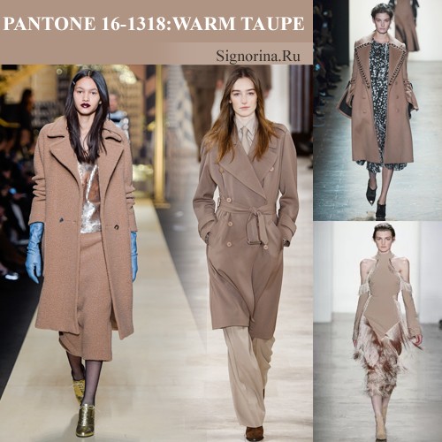 Коричневый тон с едва уловимым серым подтоном воплощает собой домашний уют и теплоту, которой часто не хватает в осенне-зимнюю пору. Оттенок Warm Taupe напоминает цвет кофе с молоком, что придаёт образу особую мягкость. Этот цвет идеален для мягких фактурных тканей, из которых получаются тёплые и уютные свитера, строгие пальто и незаменимые зимние аксессуары. Мастера рекомендуют сочетать оттенок Warm Taupe с бежевыми, горчичными, тёмно-коричневыми и красными тонами.