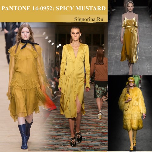 Однажды гениальный художник, чьё имя кануло в Лету, взял жёлтые краски, добавил в них немного горчичного тона и щепотку терракоты, в результате чего мир узнал об оттенке Spicy Mustard. Этот одновременно яркий и сдержанный тон обволакивает нас пряным запахом восточных специй, делая образ удивительно таинственным и притягательным. Согласно прогнозам модных экспертов, оттенок Spicy Mustard станет главным цветом грядущего сезона, т.к. он одинаково гармонично смотрится на любых фактурах и в любых исполнениях.