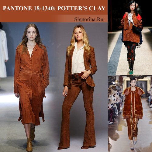 Рыже-коричневый цвет под названием Potter's Clay воспроизводит природную красоту выжженной на солнце глины и пожухлой осенней листвы. Это мягкий, но вместе с тем выразительный цвет, который гармонично смотрится на замшевых, вельветовых и кожаных фактурах. Оттенок Potter's Clay удачно соседствует с серыми, белыми, красными и зелёными тонами.