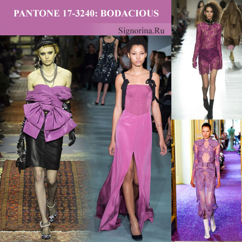 Bodacious - самый нетипичный участник осенне-зимней палитры. Этот оттенок совмещает в себе розовые, фиолетовые и молочные тона, благодаря чему его нельзя назвать ни слишком ярким, ни слишком спокойным. Оттенок Bodacious станет излюбленным инструментом в праздничных образах, но вместе с тем он найдёт своё место и в повседневных кэжуал стилях. Оттенок Bodacious рекомендуется совмещать с нейтральной и контрастной цветовой гаммой.