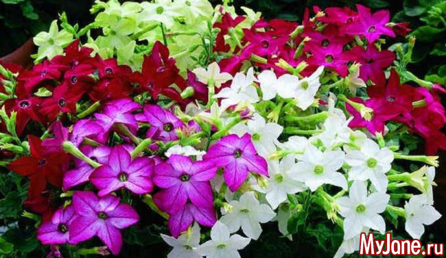 Это растение, как и петунии, относится к семейству Пасленовых. Неброские цветы-«звездочки» душистого табака раскрываются вечером и радуют сильным приятным запахом. У дикорастущего душистого табака цветы окрашены только в белый цвет, однако в настоящее время селекционерами выведено множество сортов этого растения с лепестками самой разнообразной окраски.